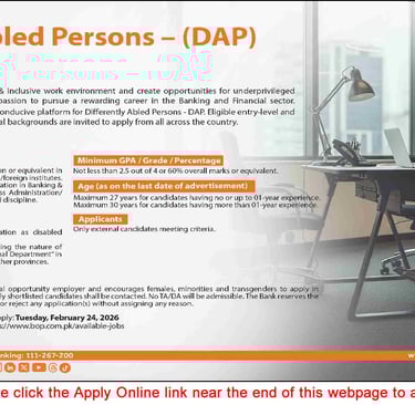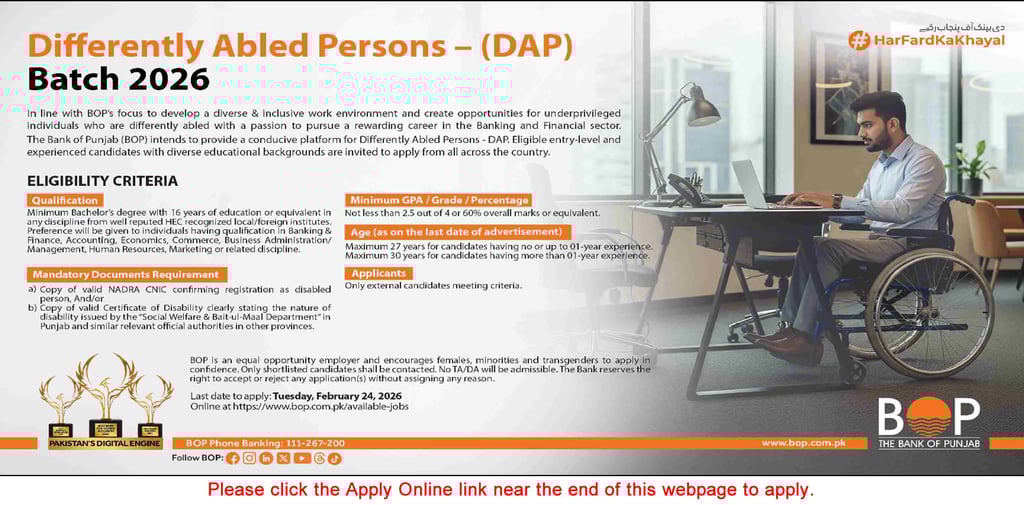 Bank of Punjab Jobs February 2026 Apply Online for Differently Abled Persons DAP BOP